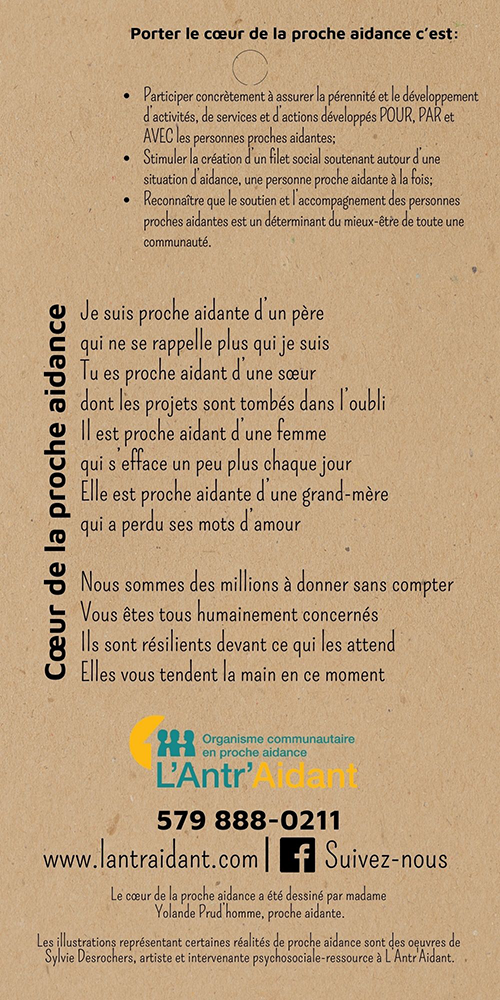 Un COEUR pour représenter les aidants, gens de cœur qui, par leur amour et leur aide, soutiennent un aidé dans son parcours. Le CŒUR, organe de la sensibilité morale, est considéré comme le siège des sentiments nobles et forts, le courage, la force d’âme, la hardiesse et la générosité. Un P et un A pour « proche aidant » y ont été insérés par Mme Yolande Prud’homme. Les illustrations représentant certaines réalités de proche aidance sont des oeuvres de Sylvie Desrochers, artiste et intervenante psychosociale-ressource à L’Antr’Aidant.